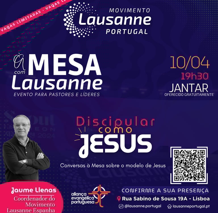 O Movimento Lausanne convida pastores e líderes para um jantar exclusivo e gratuito com Jaume Llenas, Coordenador do Movimento Lausanne Espanha. Será um momento de comunhão, encorajamento e visão, onde abordaremos os desafios da missão nos dias de hoje e como podemos apoiar-nos mutuamente para um impacto mais profundo.