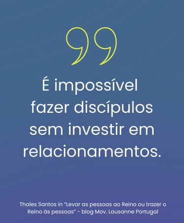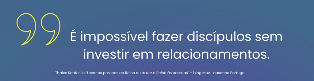 Outra coisa importante, discipulado não é apenas para quem faz parte do Corpo. “Evangelizar os de fora, discipular os de dentro” - isto está errado se a frase significar uma fragmentação. Podemos, e devemos, discipular os perdidos, porque isso é mais do que sentar-se à frente de alguém com a Bíblia aberta e orar por ele; esta missão mostra-nos que muitas vezes as nossas atitudes falam mais alto do que as palavras. Em determinadas situações, não vais poder abrir a Bíblia, mas vais poder agir com compaixão no trabalho, vais dizer a verdade enquanto todos mentem, vais ser firme enquanto tentam desviar-te, vais servir àquela pessoa menos “fixe” que ninguém dá a mínima. Pelo menos uma pessoa vai intrigar-se com o que fazes de diferente e vai perguntar-te o motivo disso, e é aí que deves falar. Repara: “Estejam sempre preparados para responder a todos os que vos interrogarem acerca da esperança que têm.” (1 Pedro 3:15); a questão é “por que é que me interrogariam se me pareço com o mundo?”.