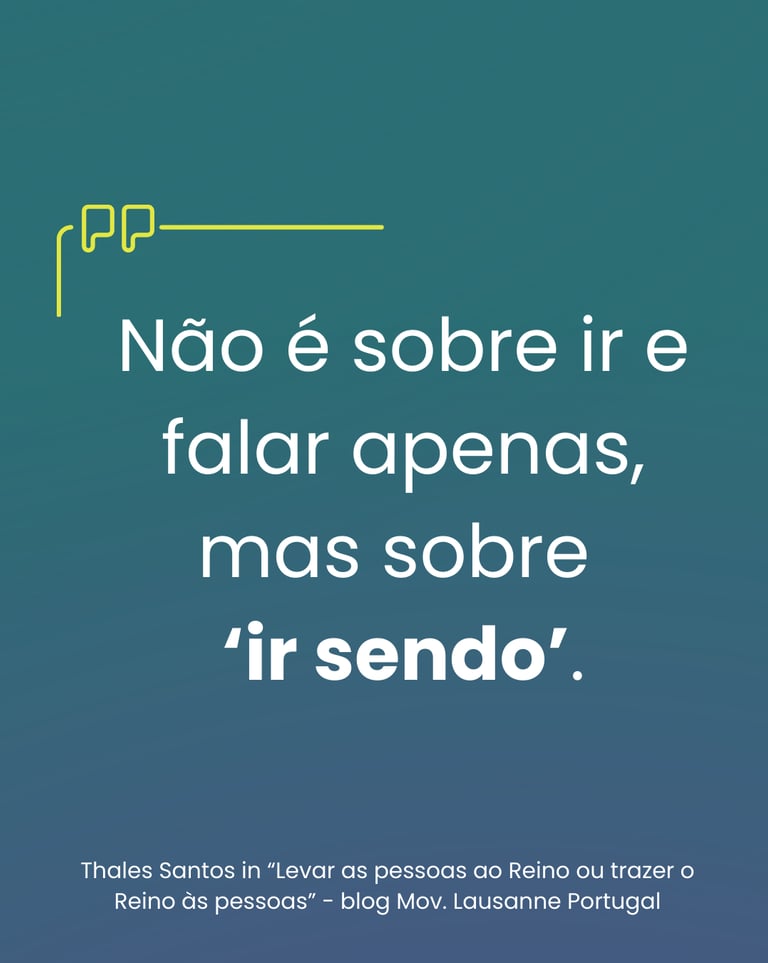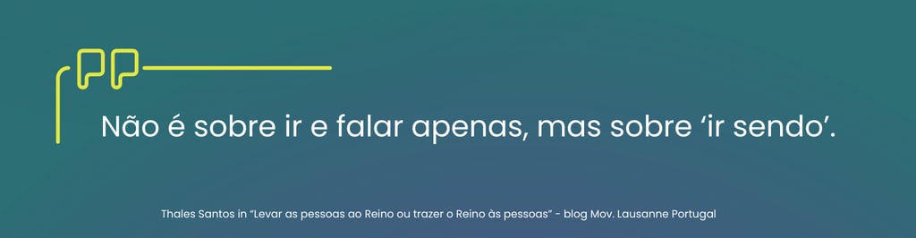 Atentemos por um momento ao que Jesus nos diz em Mateus 28:19,20: "Portanto, ide e fazei discípulos de todas as nações, batizando-os em nome do Pai, e do Filho, e do Espírito Santo, ensinando-os a guardar todas as coisas que eu vos tenho mandado. E eu estou convosco todos os dias, até ao fim do mundo". A ênfase de Jesus não está na pregação em si só, mas no “ide e fazei discípulos”. Isso responde às nossas primeiras questões sobre a missão e chamado da Igreja de Cristo - os Seus discípulos são chamados a fazer discípulos de todas as nações. Ou seja, a nossa discussão não deveria ser “Evangelismo x Discipulado”, porque não existe esta separação - a pregação está intimamente atrelada a este chamado de discipulado. Não é sobre ir e falar apenas, mas sobre “ir sendo”. É um imperativo com um chamado contínuo.